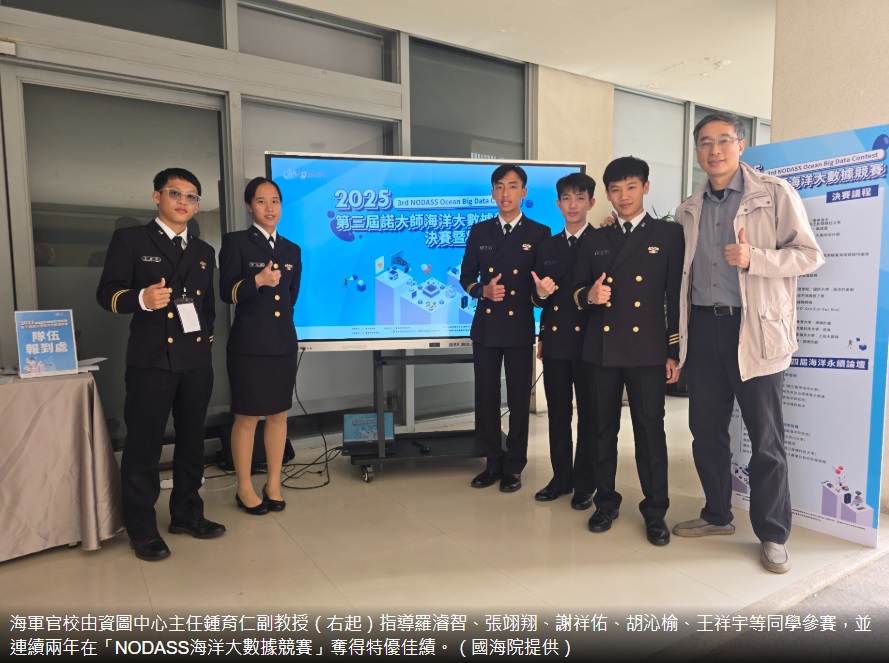 海軍軍官學校與國防大學理工學院攜手參賽,組隊參加由國家海洋研究院舉辦的「2025年NODASS海洋大數據競賽」,昨(18)日在決賽中勇奪大專組特優殊榮,兩校延續跨校合作成果,憑藉穩健的研究實力與團隊默契,接連兩屆榮獲特優肯定,展現軍事院校在海洋科技與跨域應用上的持續深耕與卓越表現。
