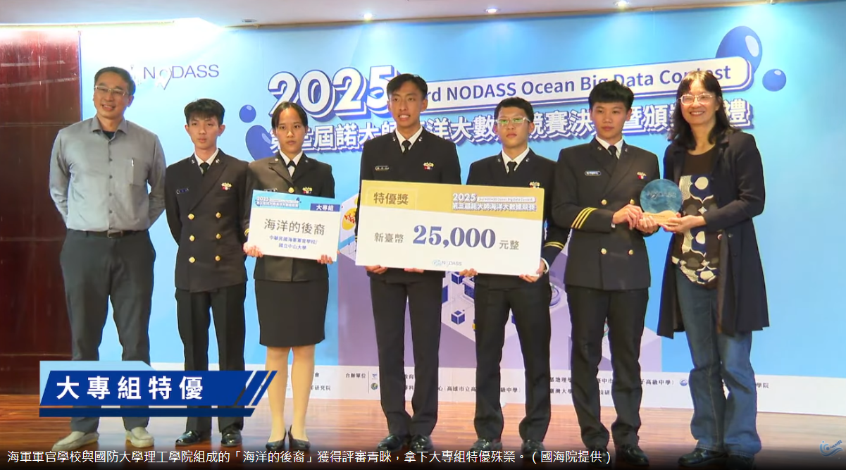 這屆NODASS海洋大數據競賽自今年度5月份迄今,歷經初賽、複賽、工作坊等階段,在眾多大專院校的激烈競爭中,海軍官校與理工學院聯隊憑藉穩健的實作能力與團隊默契脫穎而出,勇奪大專組特優殊榮,具體展現軍事院校在海洋科技、數據科學、人工智慧、國防科技等跨域應用上的持續突破與表現,以及培育國軍未來科技專業人才的卓越成效。